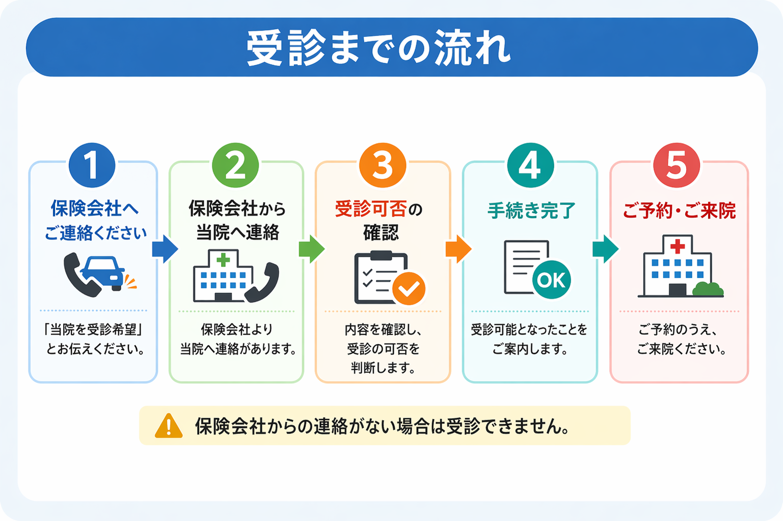 保険会社から当院へ連絡後、内容確認を行うため、お電話にてご予約をお願いいたします。